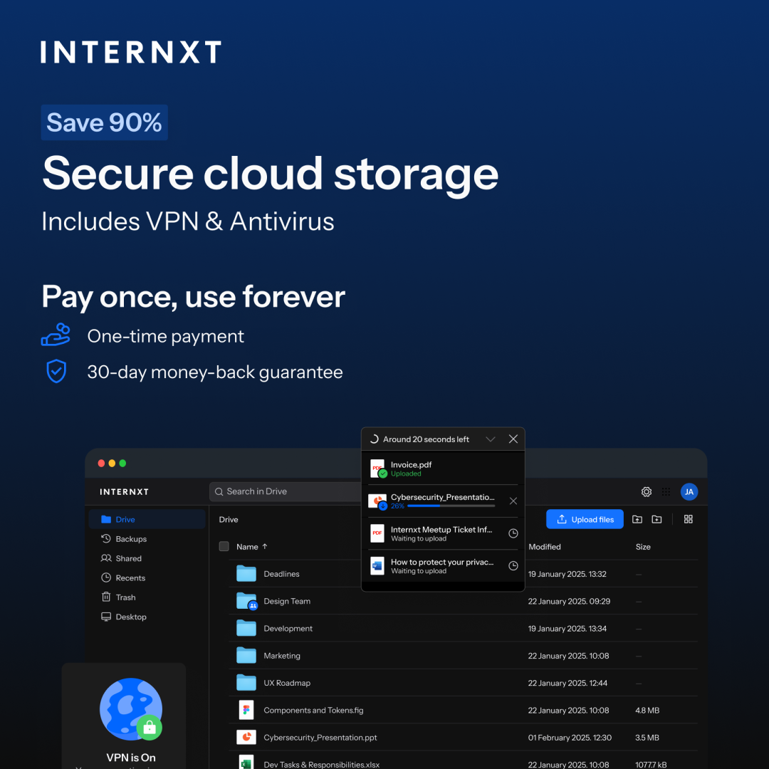 Internxt ist ein Open-Source-Anbieter für End-to-End-verschlüsselten Cloud-Speicher, der Deine Dateien unter Wahrung absoluter Privatsphäre speichert und sie vor KI, Marketing durch Dritte und vor Datenverstößen schützt.
