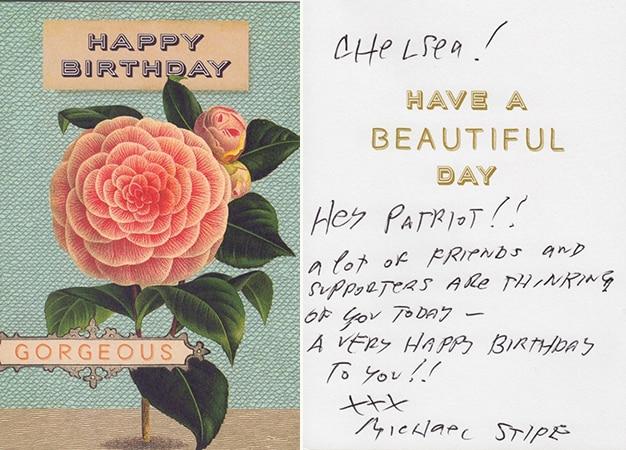 Michael Stipes auf eine Karte geschriebene Botschaft ist kürzer, aber nicht weniger bemerkenswert. „Hey Patriotin!! Viele Freunde und Unterstützer denken heute an dich – dir einen sehr herzlichen Glückwunsch zum Geburtstag!! XXX, Michael Stipe“.