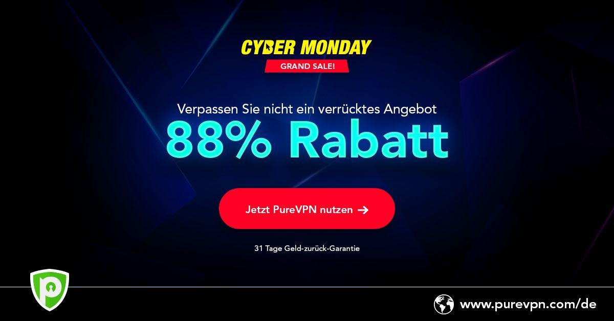Die Cyber Monday Rabatt Aktion mit garantiert 88% Rabatt!!! Wer heute bei PureVPN den 5-Jahres-Plan abschließt, zahlt monatlich nur 1,18 Euro.