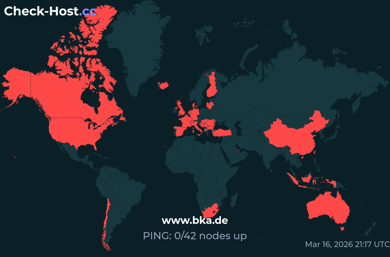 Wir haben bei der Testseite check-host.cc diverse Ping- und http-Tests durchgeführt und können die mangelnde Erreichbarkeit der Seiten zum fraglichen Zeitpunkt bestätigen. Die Verbindungsprobleme zu bka.de kann man auch unserem Beitragsbild ablesen. Bei den dunklen Flächen handelt es sich übrigens um Länder ohne Server von Check-Host. Das ist kein Anzeichen dafür, dass die Seiten nicht erreichbar waren. Wir haben selbst auch versucht, die Portale zu besuchen, was zum fraglichen Zeitpunkt nicht gelang.