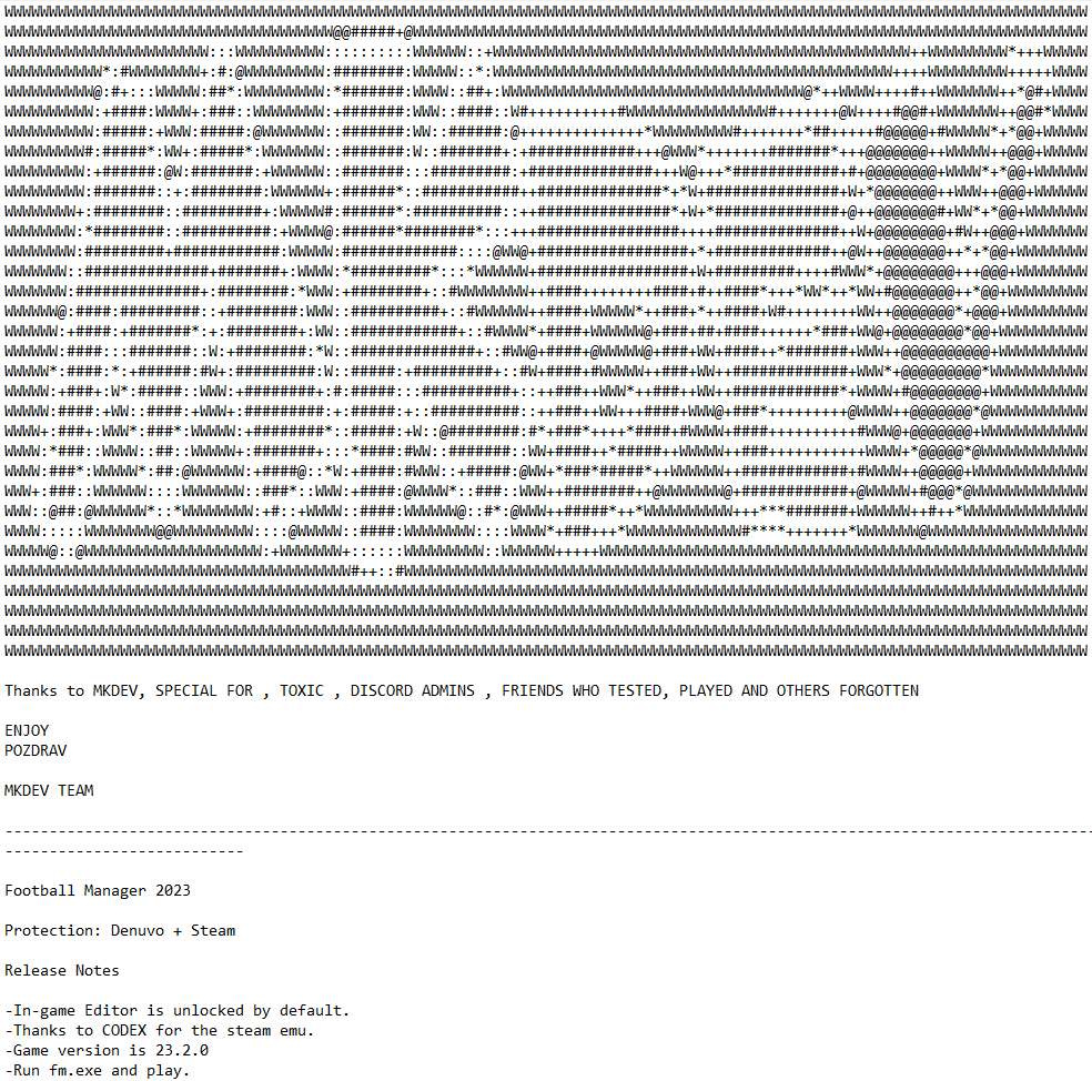 Seit mindestens November 2022 arbeitete die P2P-Group MKDEV an der illegalen Veröffentlichung von Football Manager 2023, die offenbar noch von ein paar Bugs befreit werden musste. Erstmalig erschien das Spiel bei Steam am 8. Nov. 2022. Doch der Crack betrifft die neuere Version 23.2.