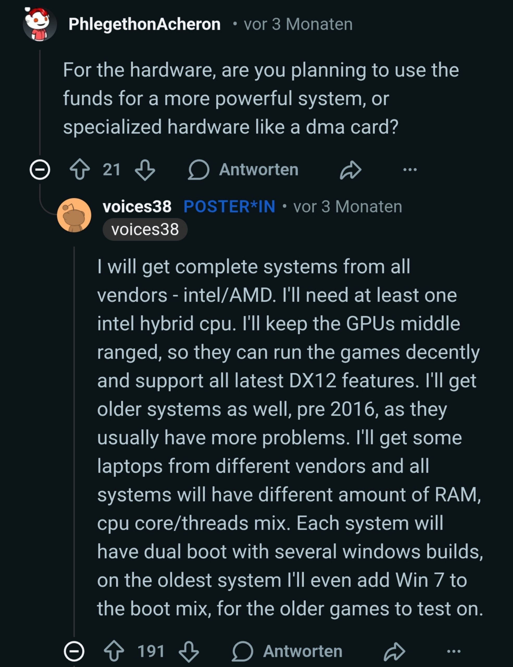 Die Hypervisor-Cracks, die zwischenzeitlich erschienen sind, haben wir bei unserer Berichterstattung bewusst übersprungen. Gemeint ist der Ansatz, bei dem ein Spiel samt Denuvo innerhalb einer virtualisierten Umgebung (unter Kontrolle eines Hypervisors) ausgeführt wird, um das Verhalten des Programms von außen zu beobachten oder zu beeinflussen, ohne den eigentlichen Spielprozess direkt zu patchen. Derartige Cracks waren aber in der Vergangenheit selten von langer Dauer. Manchen Gamern wird es egal sein. Lieber ein vorübergehender Crack als gar keiner, wird sich so mancher denken. 0xZeOn hat seit Ende 2025 gleich mehrere Cracks veröffentlicht.