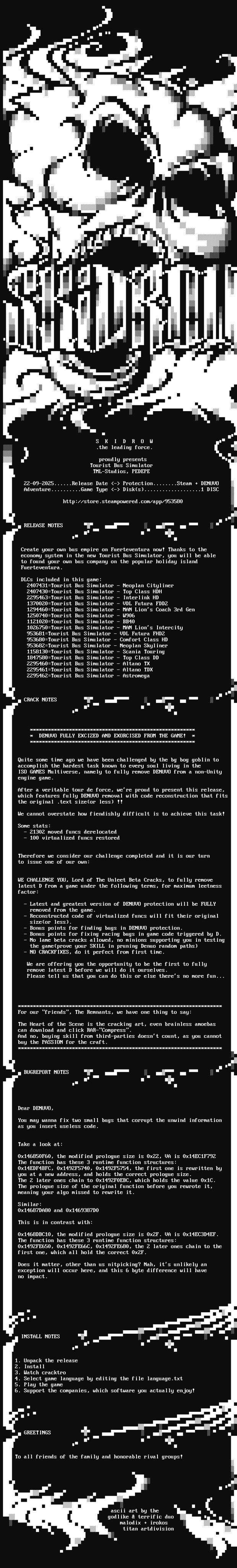 Wie die Release Group Skidrow im eigenen NFO schreibt, habe man seinerzeit die Herausforderung des Goblin, wahrscheinlich ist Empress bzw. Voksi gemeint, angenommen. Die Aufgabe im „ISO Games Multiversum“ bestand fortan darin, den Kopierschutz von Denuvo vollumfänglich von einem Spiel zu entfernen, auf der keine Unity-Spiele-Engine läuft. An 100 Stellen habe man die Virtualisierung von Denuvo entfernt. An 2.102 Stellen musste man Einfluss auf den Quellcode nehmen, damit der „Tourist Bus Simulator“ auch als Crack lauffähig ist.