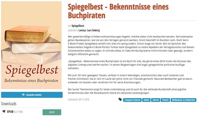 Offenbar ist den Betreibern von LUL.to selbst der niedrige Preis für das neue E-Book von Spiegelbest zu hoch, denn anders ist es nicht zu erklären, warum die „Bekenntnisse eines Buchpiraten“ nun in deren Portfolio aufgenommen wurde. Eigentlich haben wir nach dem Upload bei Oboom schon früher mit dem illegalen Erscheinen dieses Werkes gerechnet. Zu befürchten war es sowieso.