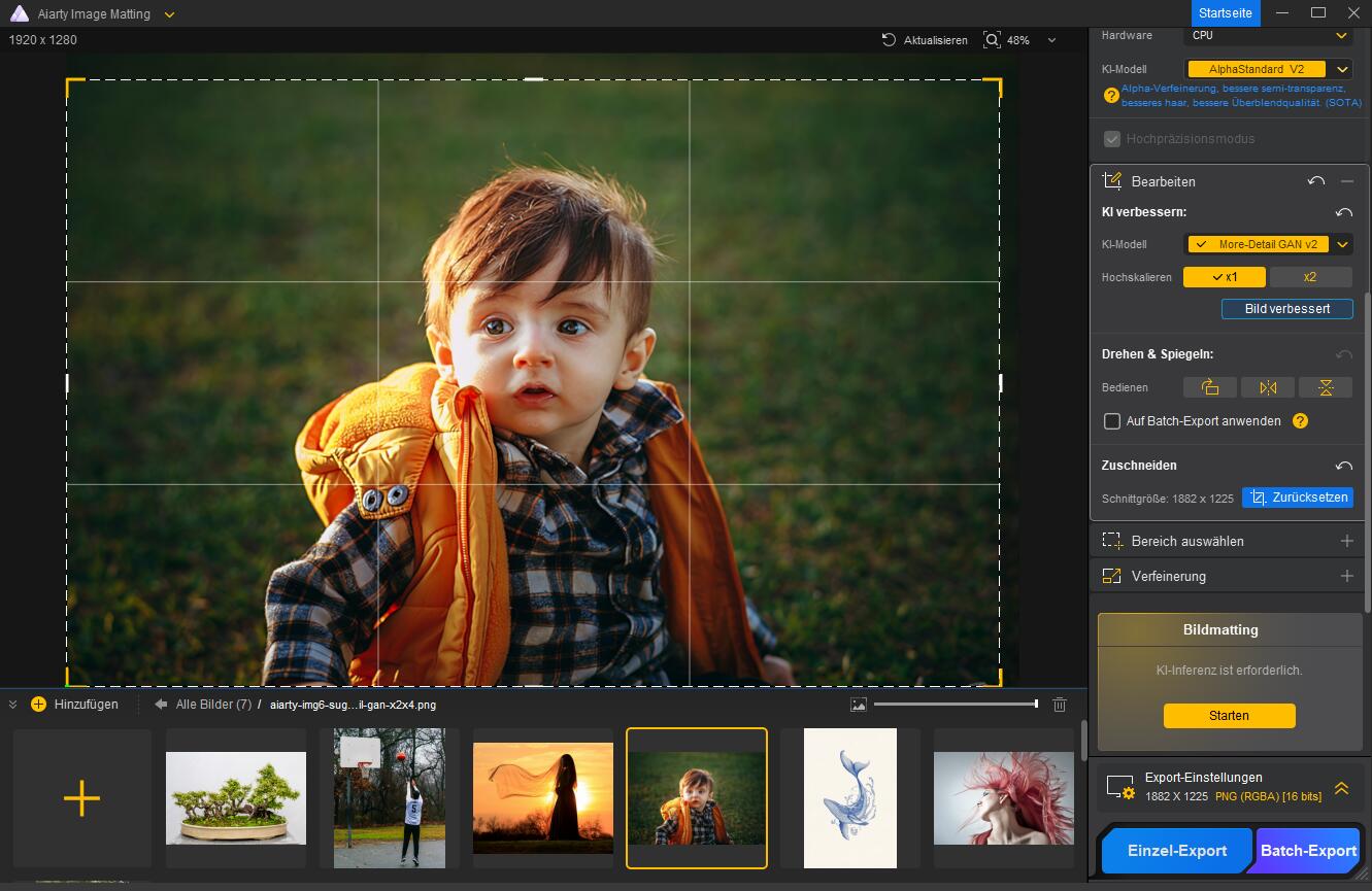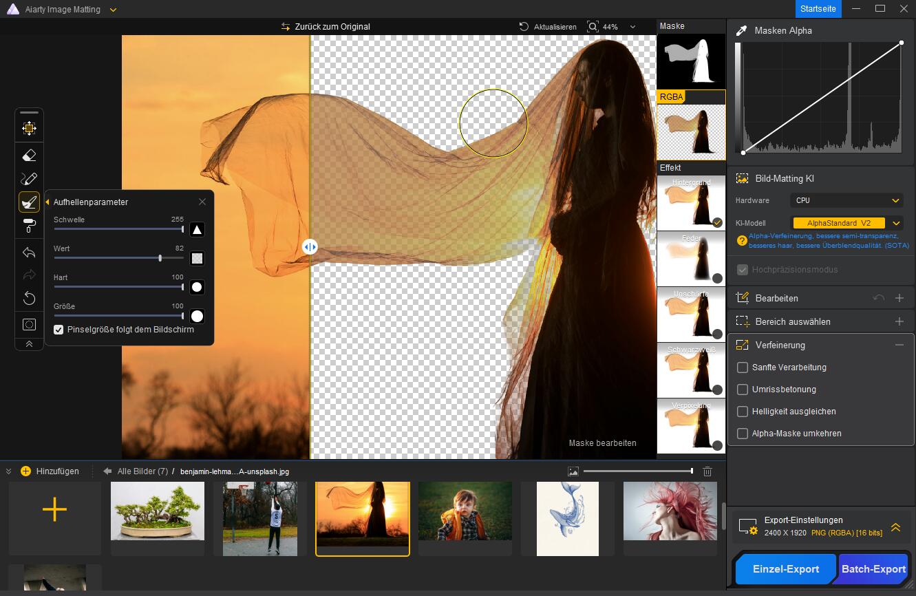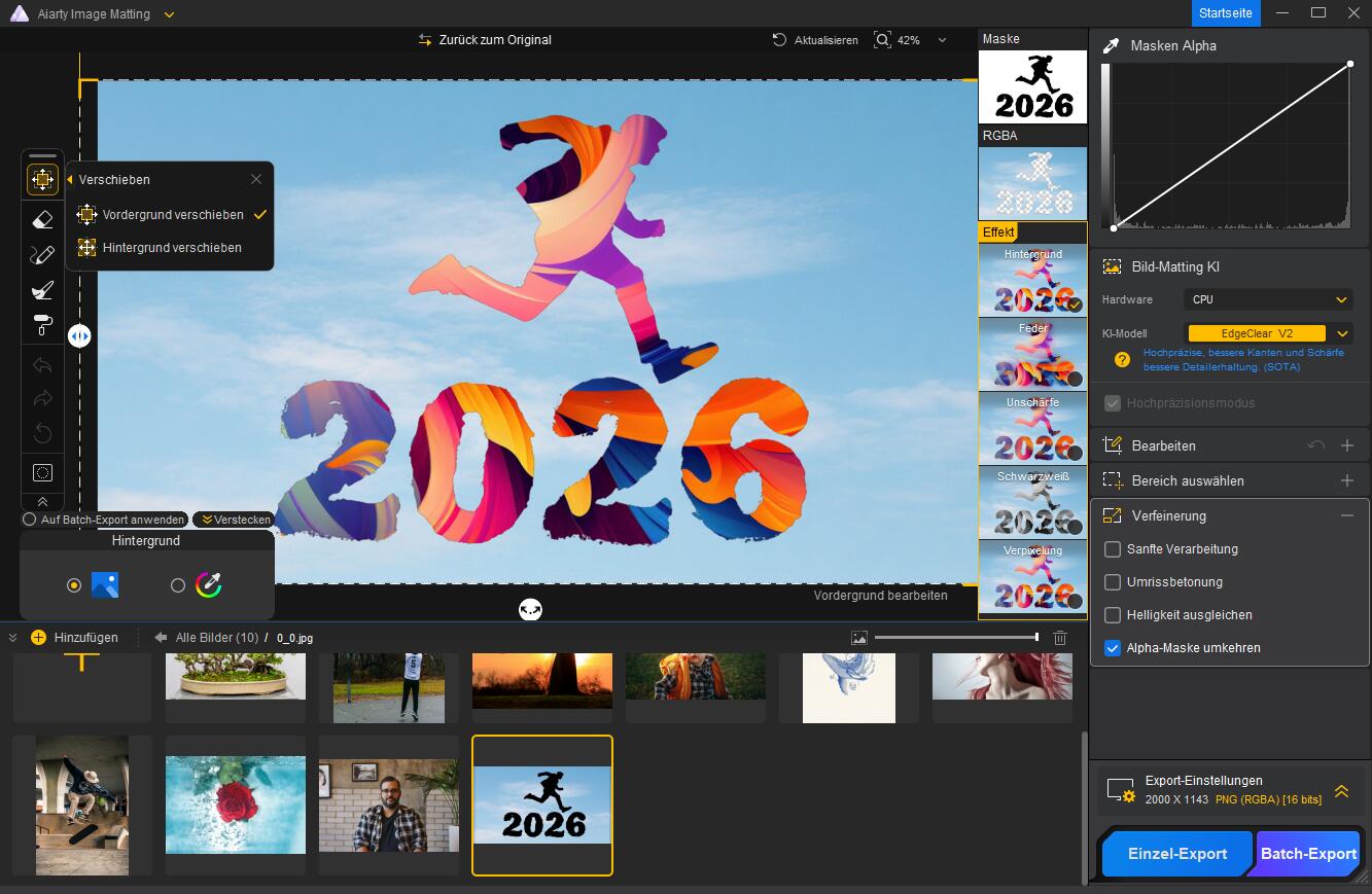 Ein großer Vorteil ist die Batch-Verarbeitung. Bildverbesserung, Hintergrundentfernung, Effekte und Hintergrundersatz lassen sich auf viele Bilder gleichzeitig anwenden. Mit der Option „Auf Batch-Export anwenden“ bleiben alle Ergebnisse konsistent – ideal für größere Bildmengen.