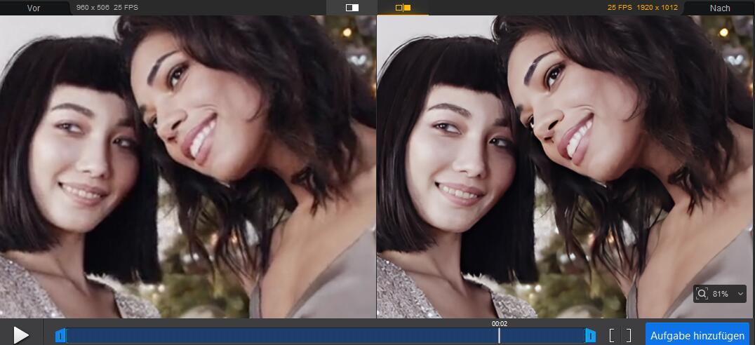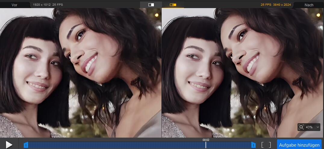 Das Ausgangsmaterial war weich, detailarm und hatte wenig Dynamikumfang. Nach dem Upscaling auf 1080p wirkte das Video deutlich klarer. Hauttexturen, feine Muster und Kanten wurden sichtbar rekonstruiert. Das Rauschen war reduziert, ohne dass das Bild verwaschen wirkte.