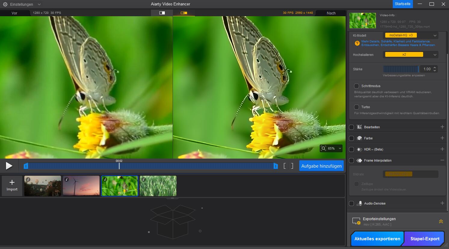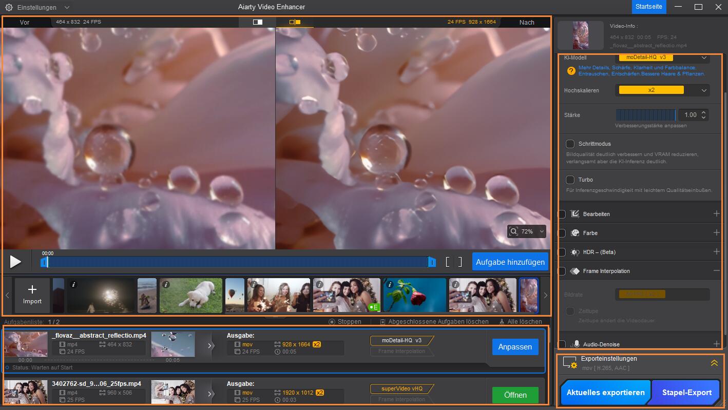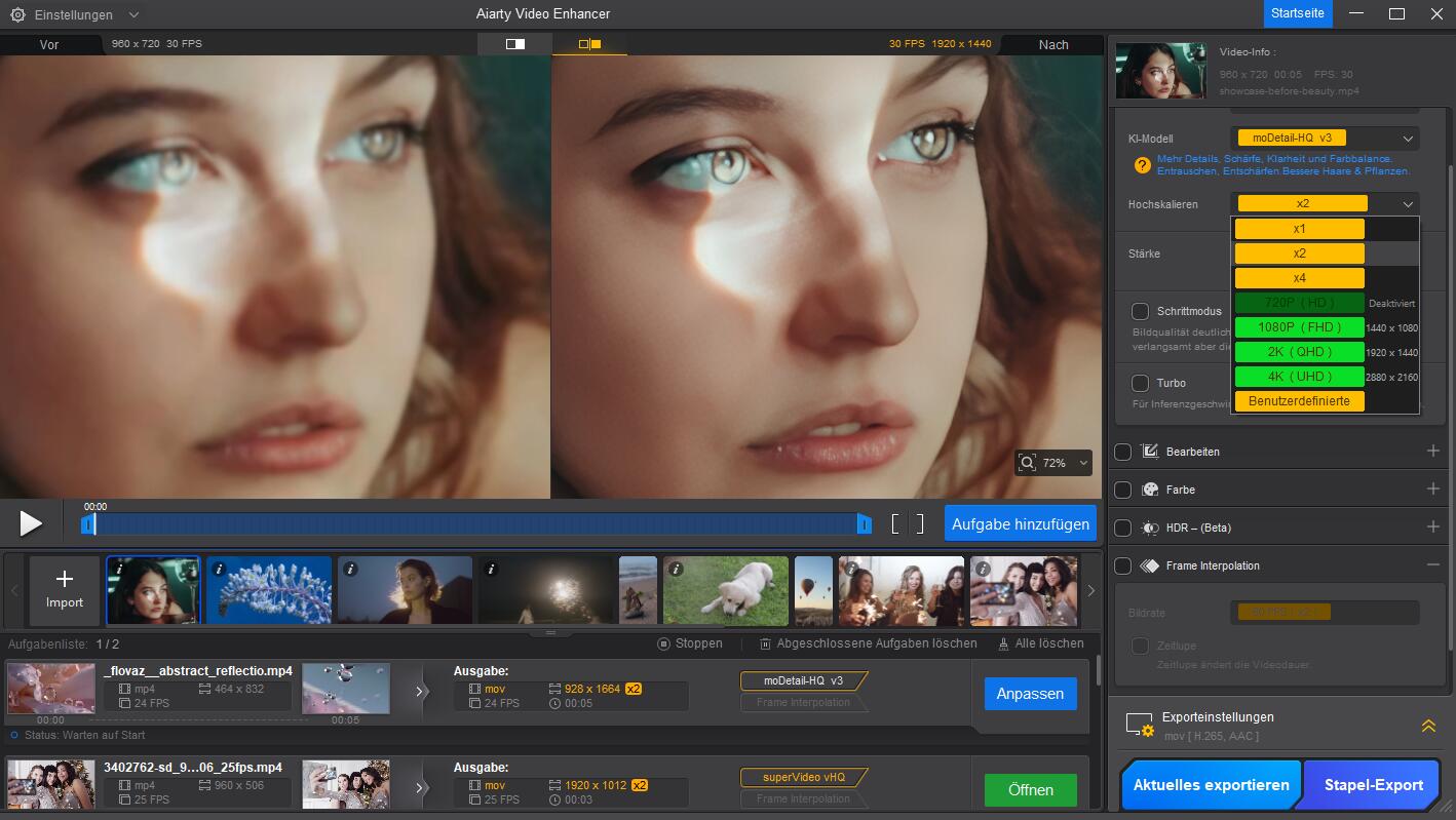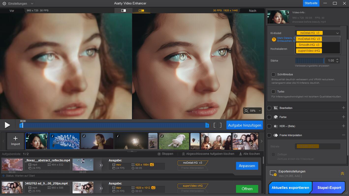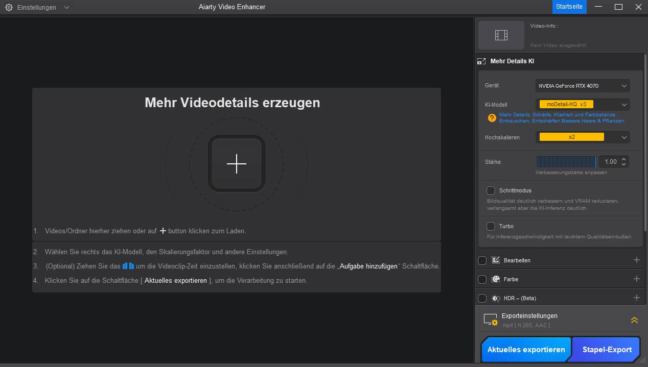 Die Benutzeroberfläche ist übersichtlich und funktional. Sie zeigt eine große Vorschau, rechts die Modelleinstellungen und unten den Exportbereich. Im Vergleich zu großen Tools wie Topaz Video fühlt sich Aiarty leichter, reaktionsfreudiger und für Einsteiger angenehmer an, ohne dass fortgeschrittene Funktionen fehlen.