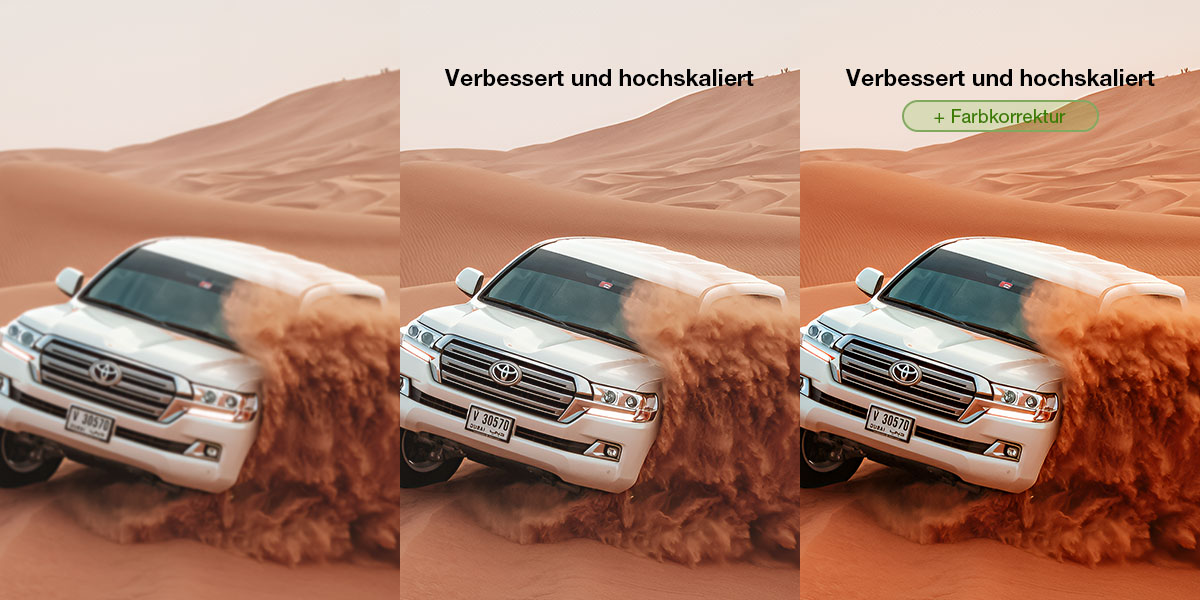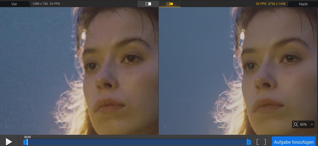 - Upscaling auf HD/4K: Erhöht die Auflösung und rekonstruiert Details. Alte oder niedrige Qualitätsaufnahmen wirken klarer und eignen sich besser für moderne Displays.
