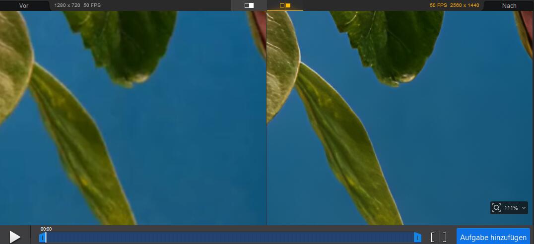 Für bestmögliche Ergebnisse bietet sich eine schrittweise Skalierung an, zum Beispiel zwei Mal hintereinander eine 2×-Skalierung. Dadurch bleiben Details besser erhalten.