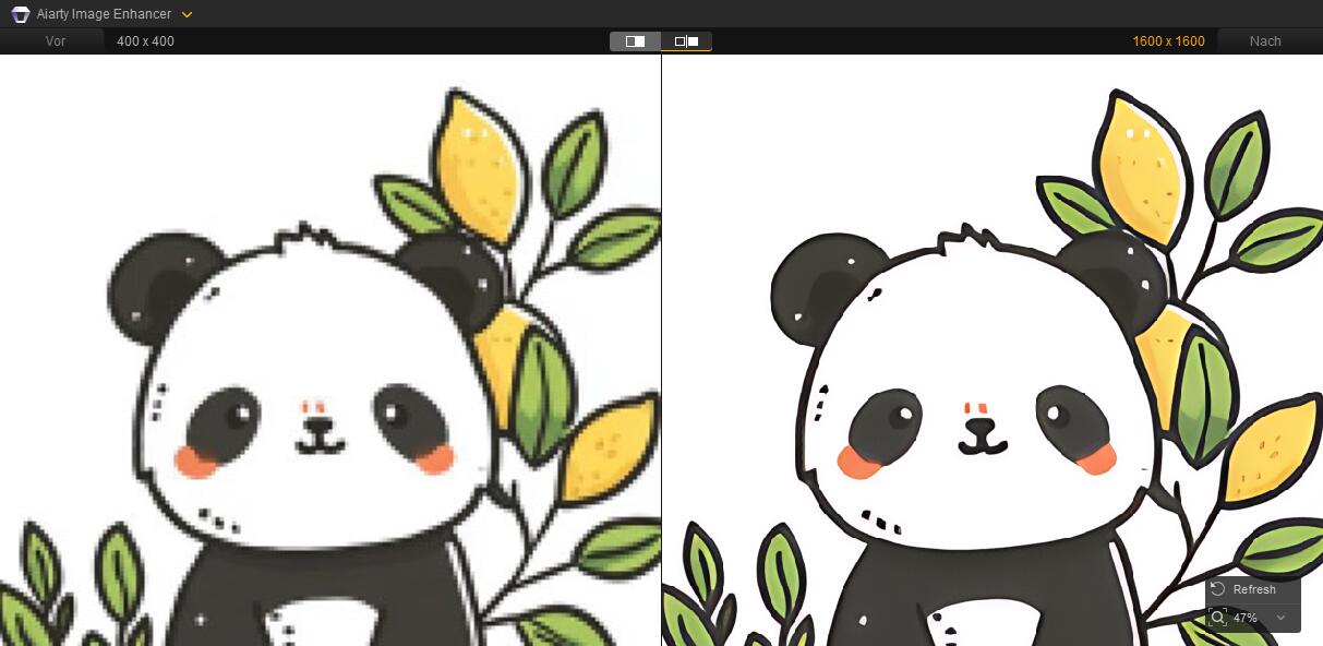 Aiarty skaliert Bilder Pixel für Pixel hoch und ergänzt realistische Details statt künstlicher Schärfe. Ziel ist ein natürliches Ergebnis in höherer Auflösung. Ein Beispiel: Ein 400×400-Bild wird sauber auf 1600×1600 hochskaliert.