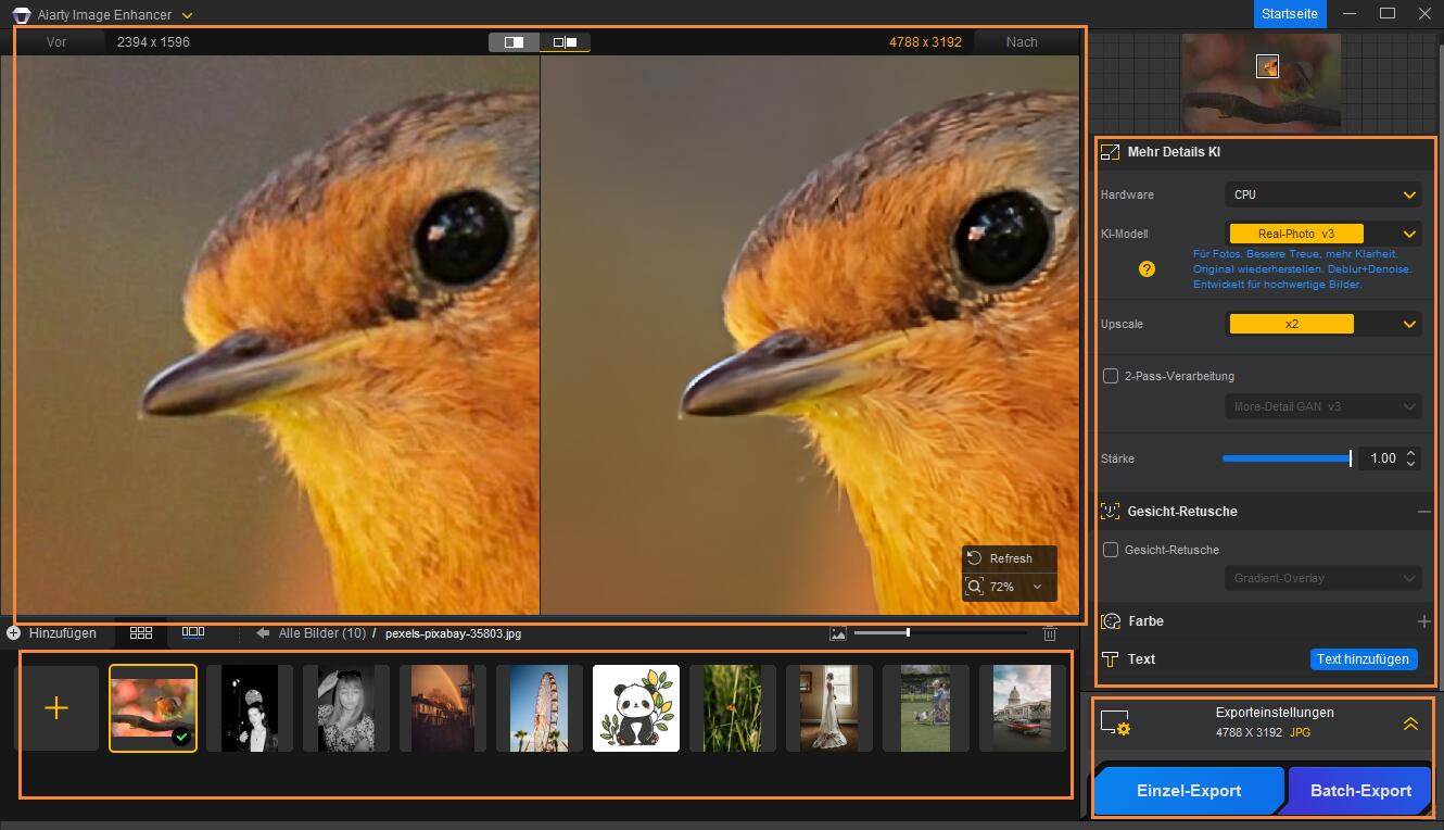 - Vorschaufenster: Zeigt Vorher-Nachher-Vergleiche zur besseren Beurteilung der Ergebnisse