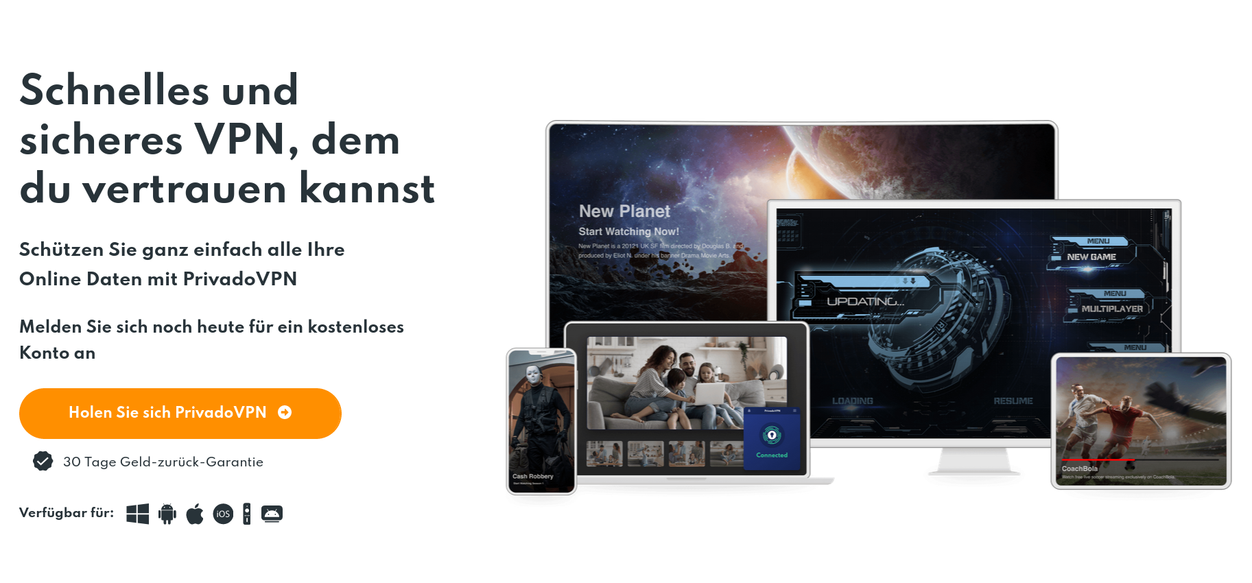 PrivadoVPN gilt als diskreter Schweizer VPN ohne Logs, das unbegrenzte Geschwindigkeiten und Daten bietet und über einen Ad-Blocker, Malware-Schutz, Kindersicherung und mehr verfügt. Privado stellt Dir zudem einfach zu bedienende Apps für Windows, Android, iOS, macOS, AndroidTV und den Amazon Firestick bereit.