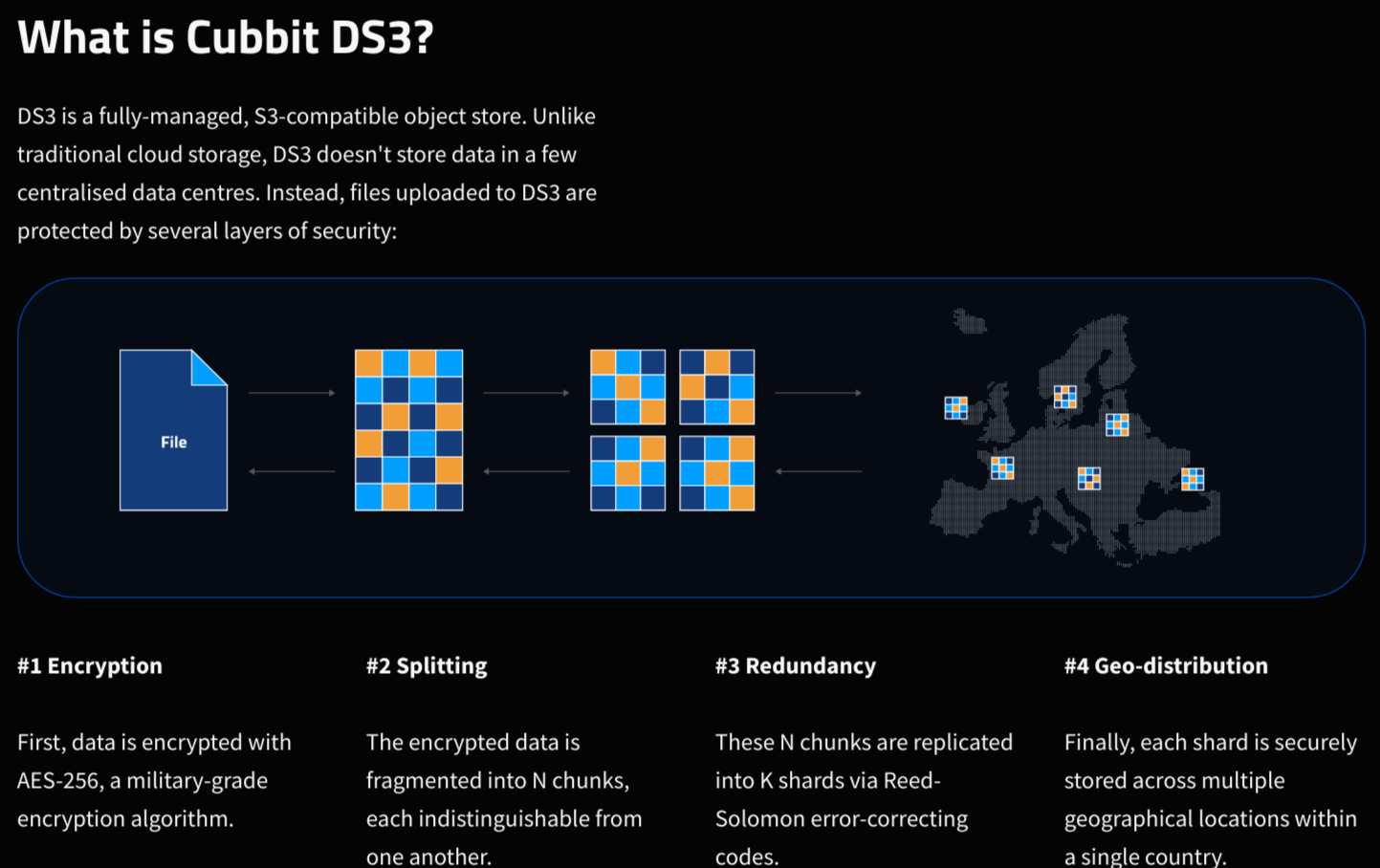 Eine Objektspeicherlösung, die in letzter Zeit immer mehr an Bedeutung gewinnt, ist Cubbit DS3. Cubbit DS3 ist Europas erster geo-distributiver Cloud-Objektspeicher, hyper-resilient, souverän und 100% S3-kompatibel. Im Gegensatz zu herkömmlichen Cloud-Speichern speichert DS3 die Daten nicht in einigen wenigen zentralisierten Rechenzentren. Stattdessen werden Dateien, die auf DS3 hochgeladen werden, durch mehrere Sicherheitsebenen geschützt: