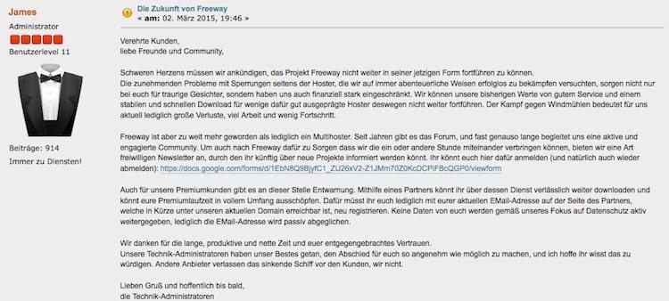 Vom Ende des Multihosters unrestrict.li haben wir am 23.02.15 berichtet. Nun folgt der nächste (thx an Anna für den Hinweis!) „Die zunehmenden Probleme mit Sperrungen seitens der Hoster, die wir auf immer abenteuerliche Weisen erfolglos zu bekämpfen versuchten, sorgen nicht nur bei euch für traurige Gesichter, sondern haben uns auch finanziell stark eingeschränkt.“ Gleich zu Beginn seine Abschiedsbriefes kommt der Administrator von Freeway ohne Umschweife zur Sache. Offen wird den Usern der Grund mitgeteilt. Dieses aufrichtige Verhalten durchzieht das gesamte Schreiben. Respekt – endlich mal ein Abgang in Würde angesichts der Negativbeispiele der vergangenen Monate. Wenn man durch Freeways Forumsbeiträge stromert, finde man in der Regel zufriedene User, die das Ende bedauern, aber offensichtlich haben kommen sehen. Seit einigen Monaten ist die Rede von Problemen: „…als ein paar Tage nachdem ich einen 3-Monats-Account gekauft habe, die Probleme los gingen. Seitdem lief doch nichts mehr richtig über mehrere Wochen.“ (Joey_2001)