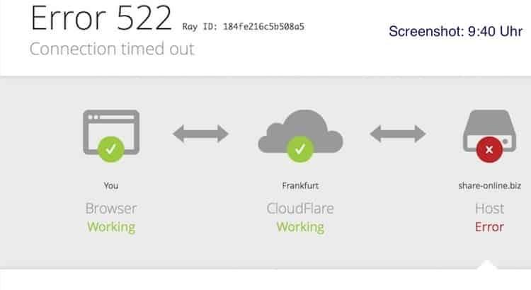 Einer der von den Boerse.bz-Uploadern häufig genutzte Sharehoster ist momentan offline. Die Verbindung funktioniert nur bis zum Anti-DDoS-Dienstleister CloudFlare. Die Gründe für die Downtime von Share-Online.biz sind unbekannt.