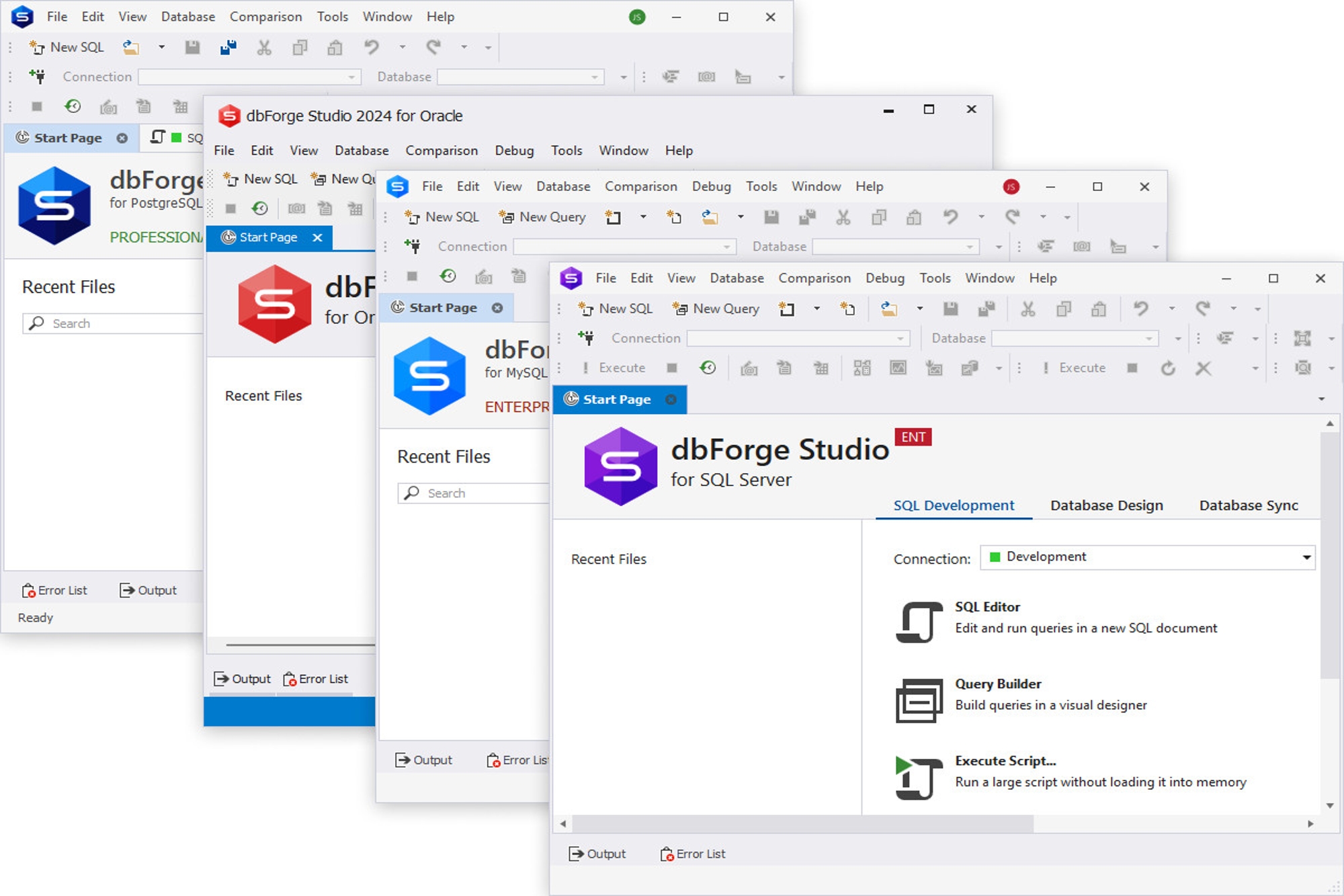 dbForge Edge vereint vier leistungsstarke Datenbank-Entwicklungsumgebungen (IDEs) in einer Suite und ist somit das ideale Multidatenbank-Tool. Es deckt Aufgaben wie Entwicklung, Management und Administration ab. Egal ob du SQL Server, MySQL, MariaDB, Oracle oder PostgreSQL verwendest – dbForge Edge bietet dir eine intuitive Oberfläche und effiziente Werkzeuge. Ohne lange Einarbeitungszeit kannst Du sofort produktiv starten.