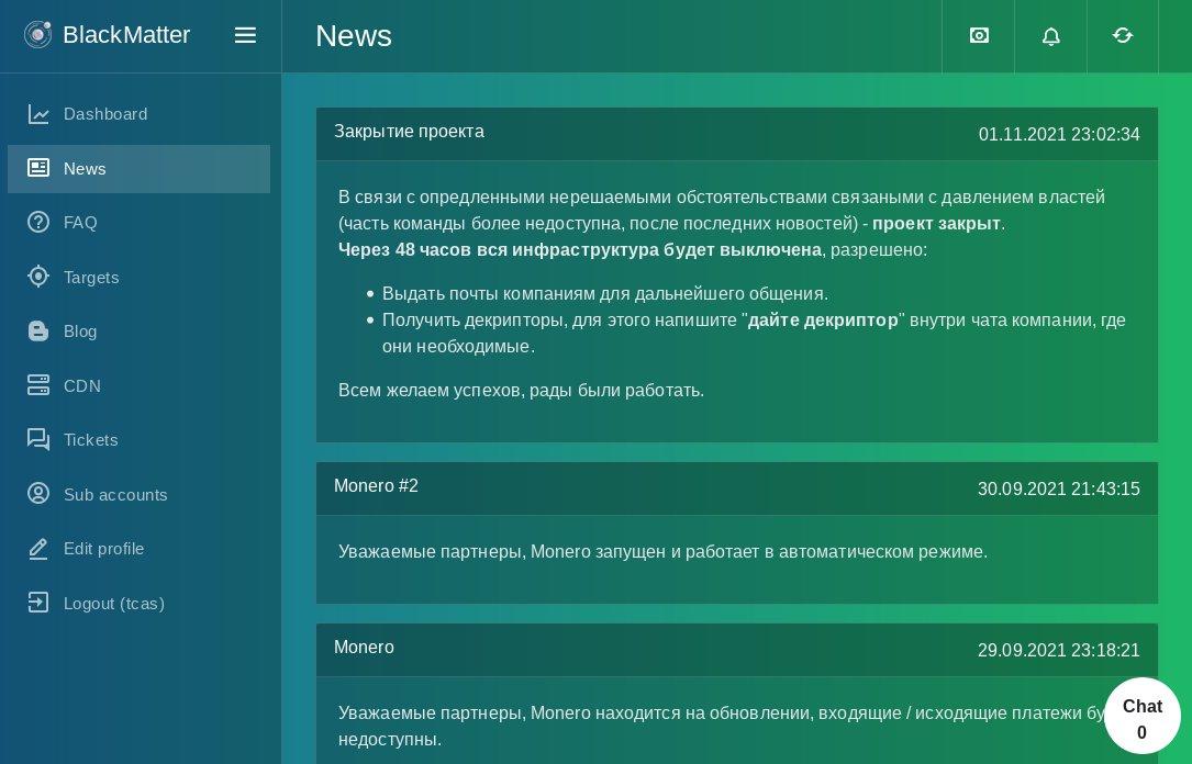 In einer Nachricht, welche im BlackMatter-Backend geposted wurde, geben die Entwickler der Ransomware-as-a-Service (RaaS) an, ihre Tätigkeiten einstellen zu wollen. Das Backend dient der Registrierung anderer krimineller Gruppen. Darüber gewährt BlackMatter anderen Cyberkriminellen Zugriff auf die RaaS. Die Securitygruppe vx-underground veröffentlichte und übersetzte die Nachricht. In dieser ist zu lesen: