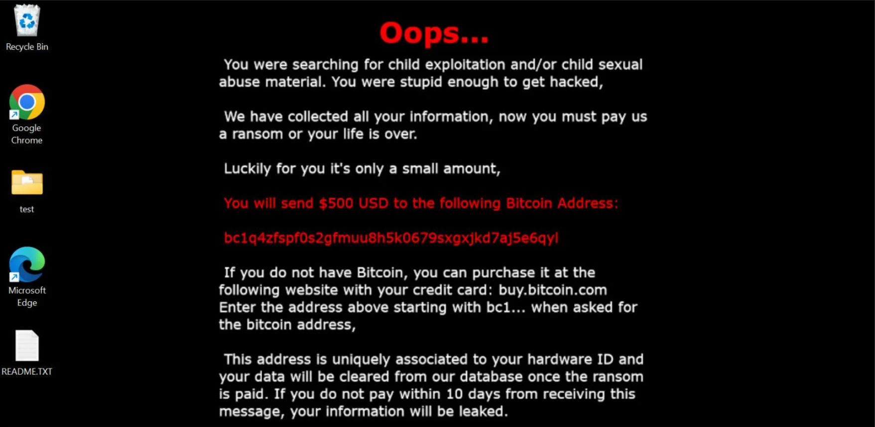 Seit 2012 haben Cyberkriminelle eine Vielzahl von Malware- und Ransomware-Programmen entwickelt, die sich als Regierungsbehörden ausgeben. Sie warnen infizierte Windows-Nutzer vor dem Konsum von CSAM (Child Sexual Abuse Material). Die Opfer werden aufgefordert, ein „Bußgeld“ zu zahlen, um zu verhindern, dass ihre Daten an die Strafverfolgungsbehörden weitergegeben werden.