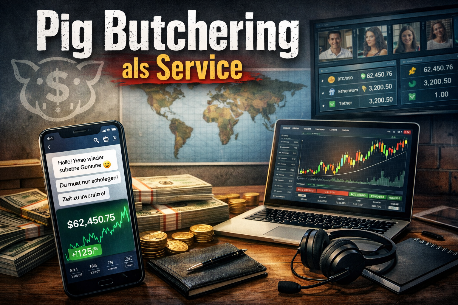 Das sind heute keine Zufallsnummern mehr. Hinter vielen Maschen steckt ein Baukasten, den man kaufen kann. Es sind Accounts und Nummern, über die man Leute anschreibt. Vorlagen, die in jeder Gruppe gleich klingen. Und obendrauf gibt es beim Pig Butchering eine Steuerung, mit der das Ganze organisiert wird. Welche Person wird warmgehalten, wer zahlt, wer soll „nachlegen“? Und wer wird zur „Verifikation“ weitergeschoben?