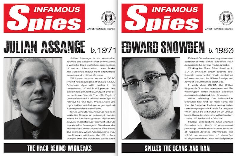 Der Defense Security Service hat in Militärbasen und staatlich genutzten Gebäuden Warnplakate aufgehängt. Darin werden Edward Snowden und Julian Assange als „berüchtigte Spione“ bezeichnet. Es geht um Stimmungsmache gegen die Whistleblower. Diese soll man nach dem Willen der Behörde in die USA ausliefern.