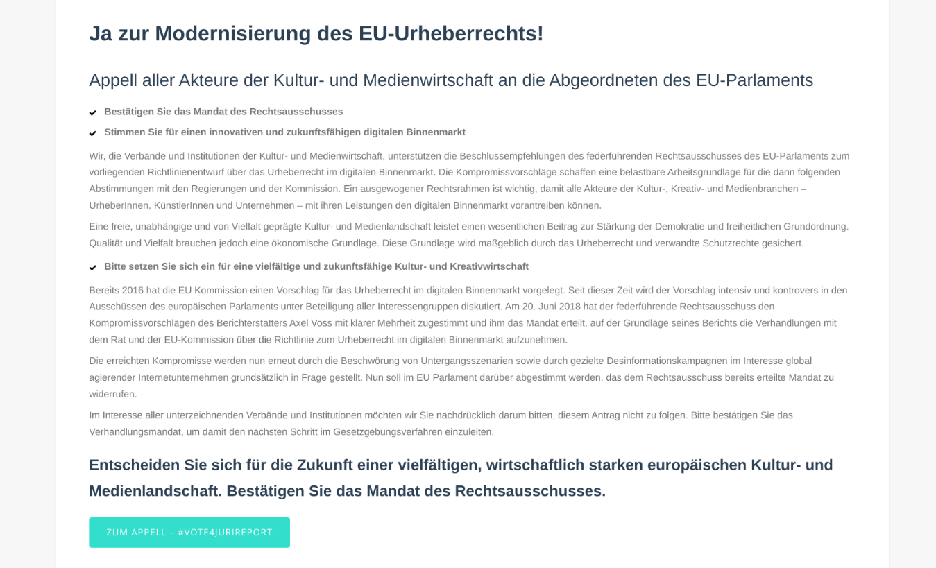 Nächsten Monat stimmt das EU Parlament darüber ab, ob man den Beschluss des Rechtsausschusses von letzter Woche bestätigt. Der Appell unter dem Hashtag #vote4jurireport richtet sich folglich in erster Linie an die stimmberechtigten Abgeordneten des EU-Parlaments. Unterzeichner sind Verbände wie der BDZV, BVMI, GVL, VDZ, VUT und viele mehr. Insgesamt wird die Lobby-Aktion von 62 Verbänden aus den Bereichen Journalismus, Film- und Musikwirtschaft unterstützt. Das zweisprachige PDF-Dokument zum Aufruf kann hier eingesehen werden.