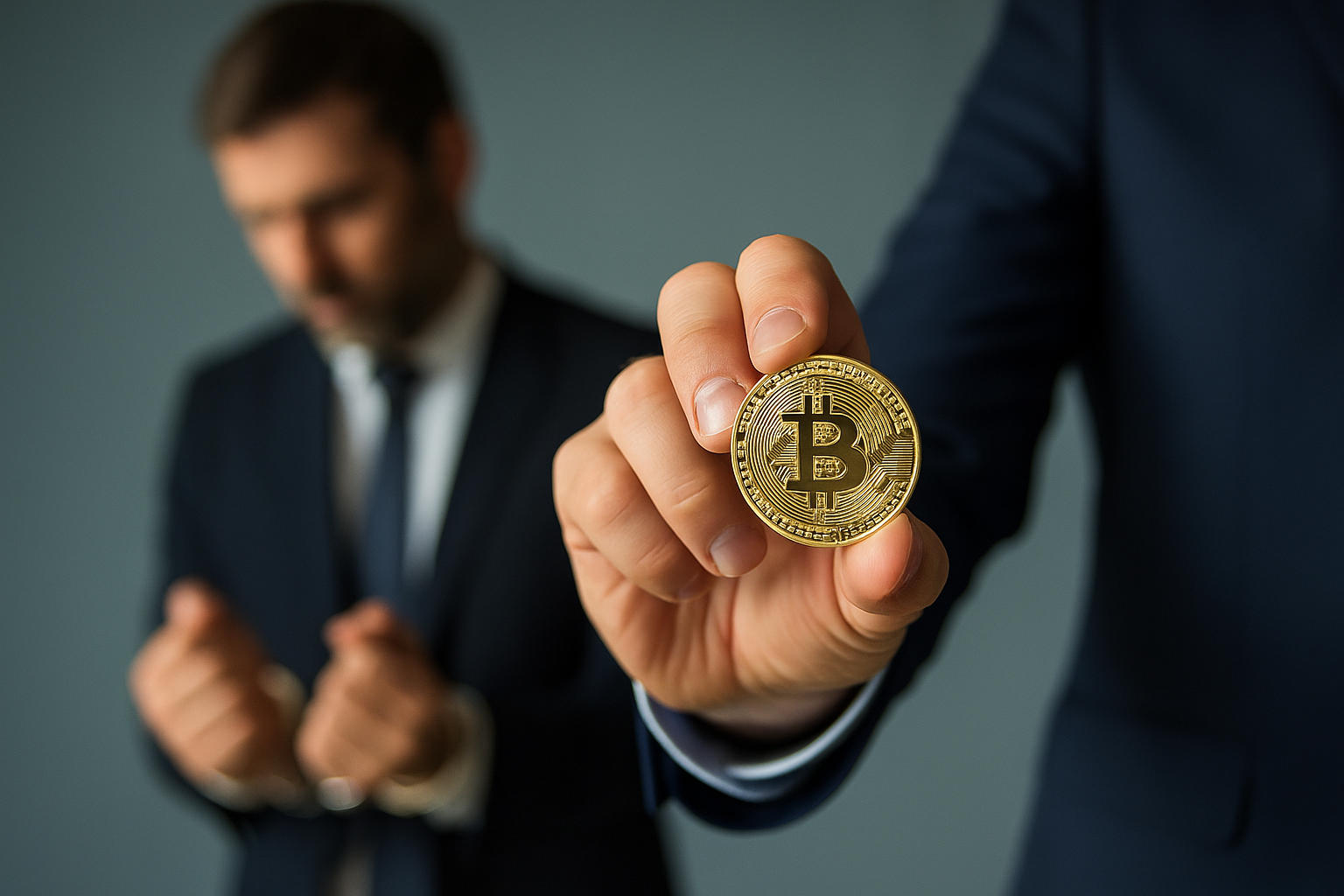 Nahaufnahme einer Hand mit einer goldenen Bitcoin-Münze. Im Hintergrund ist ein unscharfer Mann im Anzug mit Handschellen zu sehen – als Symbol für die Festnahme eines Krypto-Betrügers.