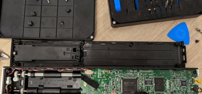 Der Doxie Go hat an der Unterseite zwei sichtbare Schrauben (0/00). Zusätzlich sind unter den vier Füßen weitere Schrauben versteckt. Nachdem alle Schrauben gelöst sind, muss man das Gehäuse sanft aufhebeln, da es vorne und hinten von Clips gehalten wird. Trotz aller Vorsicht sind mir einige abgebrochen, was aber nicht weiter schlimm ist, da die Schrauben später wieder für genug Festigkeit sorgen.