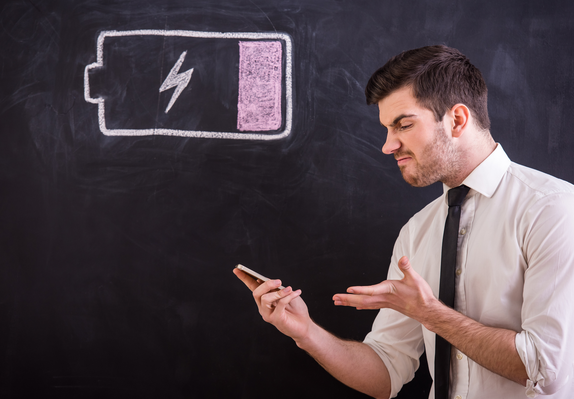 Mann schaut auf sein Smartphone mit fest verbautem und schon wieder leerem Akku (Symbolbild)