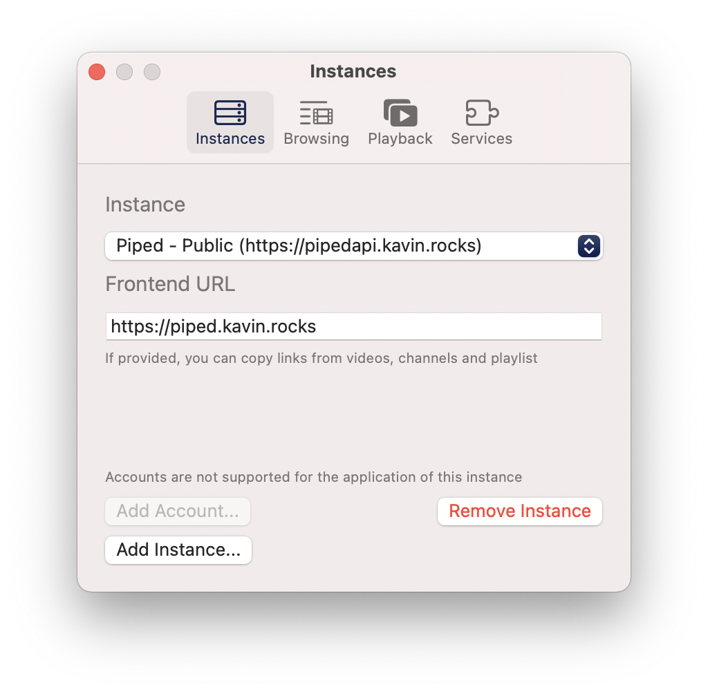 Anmeldung (optional): Wenn du bei Invidious oder Piped ein Konto hast, kannst du dich über „Add Account” → „Username/Password” direkt anmelden.