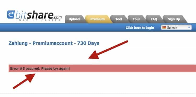 Gestern wurde bekannt, dass die beiden Betreiber von Kinox.to, Freakshare.com, Bitshare.com, Movie4k.to, Mygully.com, Boerse.sx, Stream4k.to und Shared.sx mit einem internationalen Haftbefehl gesucht werden. Im nächsten Schritt wurde den Hintermännern nun die Zufuhr ihrer Umsätze abgedreht. Die Zahlung des Premiumaccounts funktionierte in den letzten Wochen ausschließlich unter Nutzung der First Data Bank in Lettland. Der Mutterkonzern hat seinen Sitz in Atlanta, USA. Die Bank First Data Latvia fiel bereits letztes Jahr auf, weil sie Zahlundsdienstleister für die Sharehoster LetItBit und Uploading.com war. Wer jetzt bei Freak- oder Bitshare einen Premiumaccount kaufen will, erhält lediglich die oben und unten angezeigte Fehlermeldung.