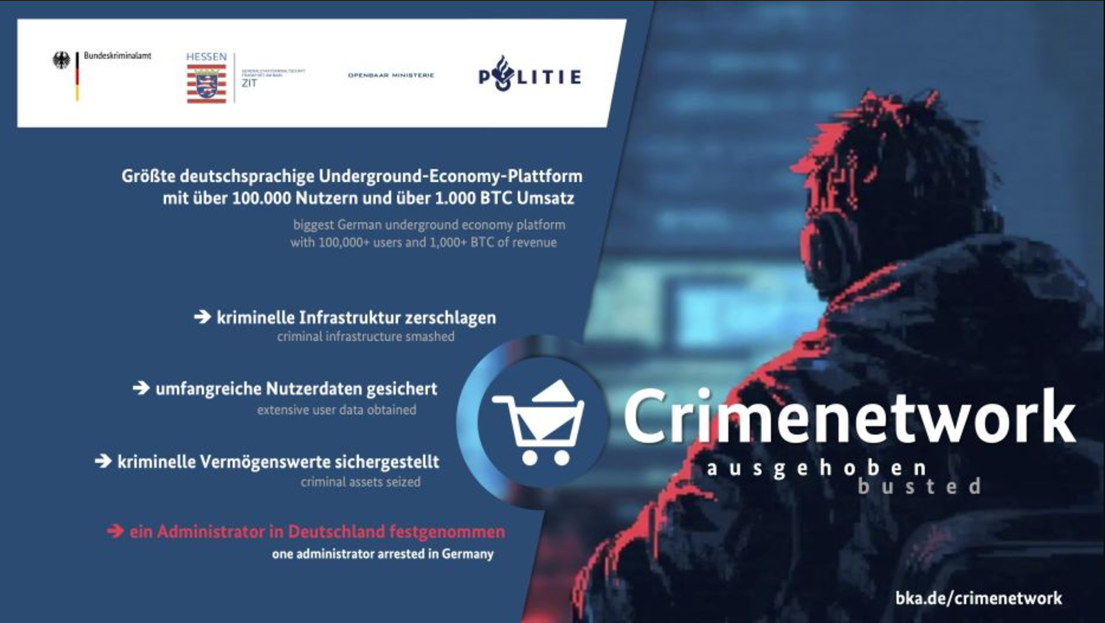 Crimenetwork-Administrator verhaftet: IT-Infrastruktur beschlagnahmt, wertvolles Beweismaterial sichergestellt.