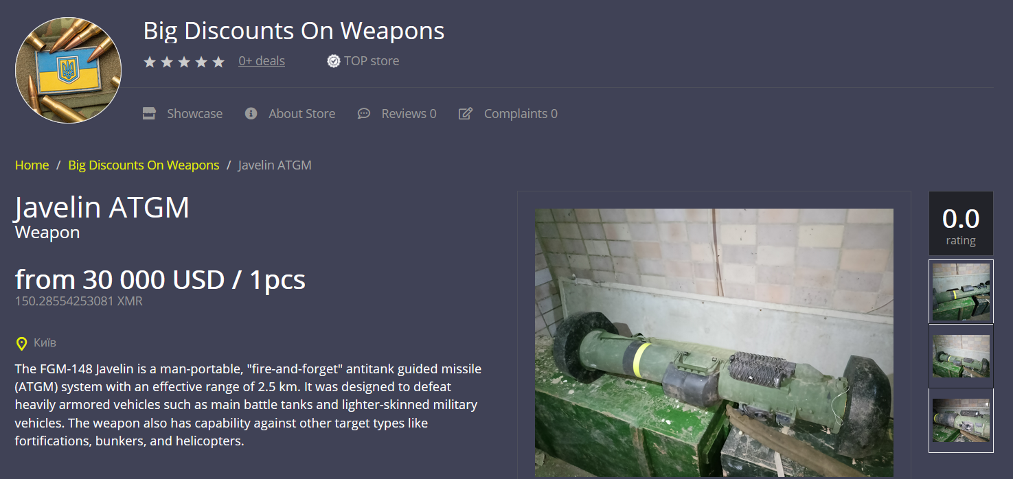 Egal, ob Javelin ATGM, Stinger MANPADS, Phoenix Ghost drones, oder Minen. Die Lagerbestände der Darknethändler scheinen derzeit mehr als nur prall gefüllt zu sein.
