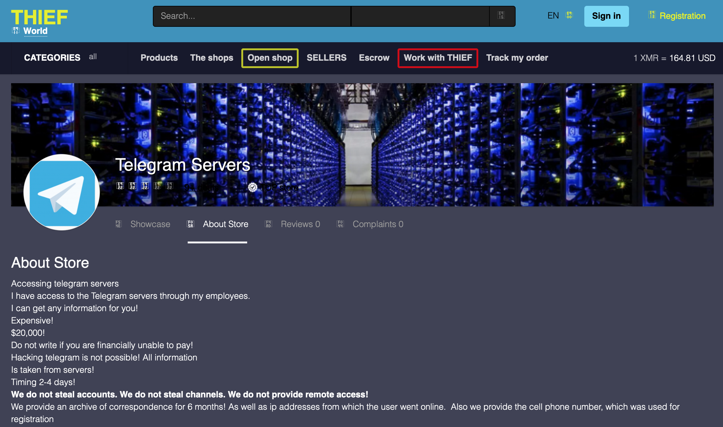 Ein Vendor (Anbieter) aus San Francisco behauptet, er könne von einem Telegram-Nutzer die Korrespondenz der letzten sechs Monate, die Liste seiner IP-Adressen und seine mit dem Account verknüpfte Handynummer für 20.000 US-Dollar besorgen. Über dieses zweifelhafte Angebot berichtete als erstes die Vergleichsseite SafetyDetectives.