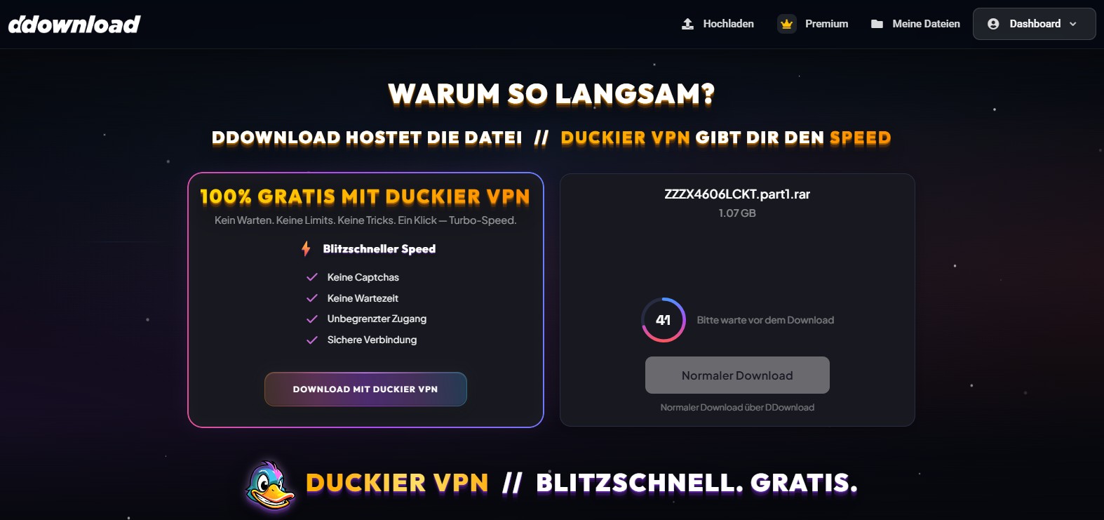 Wer bei ddl.to mit dem Browser einen Download starten will, auf den wartet aktuell Werbung des VPN-Providers Duckier, siehe Beitragsbild oben. Ehrlich gesagt, uns erinnerte die Werbung stark an Smoozed. Das war anfangs ein in der Szene verwendeter Multihoster, später machte dessen Eigentümer Deniz C. darauf einen VPN-Dienst. Dass es zumindest eine Beteiligung dieser in der Schweiz lebenden Person an DDownload gibt, diesbezüglich zirkulieren schon seit längerer Zeit Gerüchte.