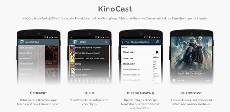 Schon im Oktober 2014 haben die Macher die erste Version des Quellcodes von KinoCast bei GitHub hochgeladen. Die Software darf von Dritte benutzen, verändern oder sogar verkaufen, sofern sie die gleiche Lizenz anwenden. Die App dient der Anzeige von TV-Serien und Kinofilmen mithilfe der Streaming-Webseite Kinox.to. Ähnlich wie bei MovieTime wird auch der HDMI-Stick Google Chromecast unterstützt. Die Filme kann man damit direkt auf den heimischen Fernseher übertragen.