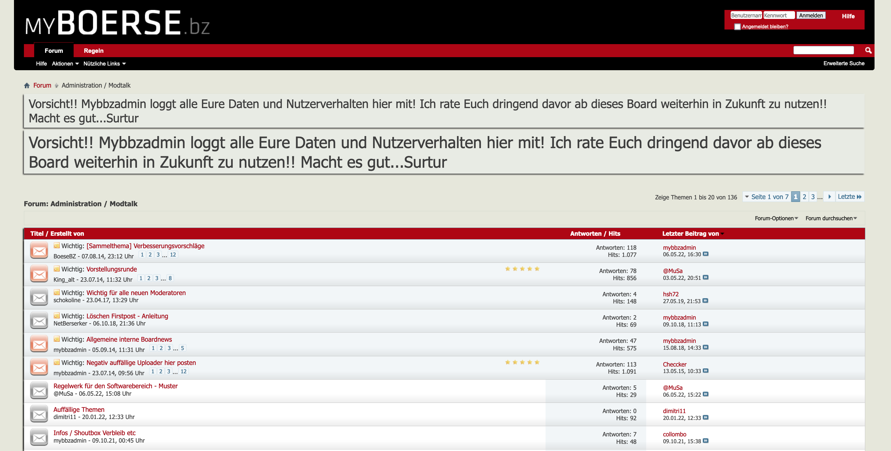 Das Forum ist passwortgeschützt, außer der überaus interne Bereich „Administration / Modtalk“, der normalen Usern natürlich regulär verborgen ist. Dort tauschen sich nur die Moderatoren und der Admin des Forums myboerse.bz aus.