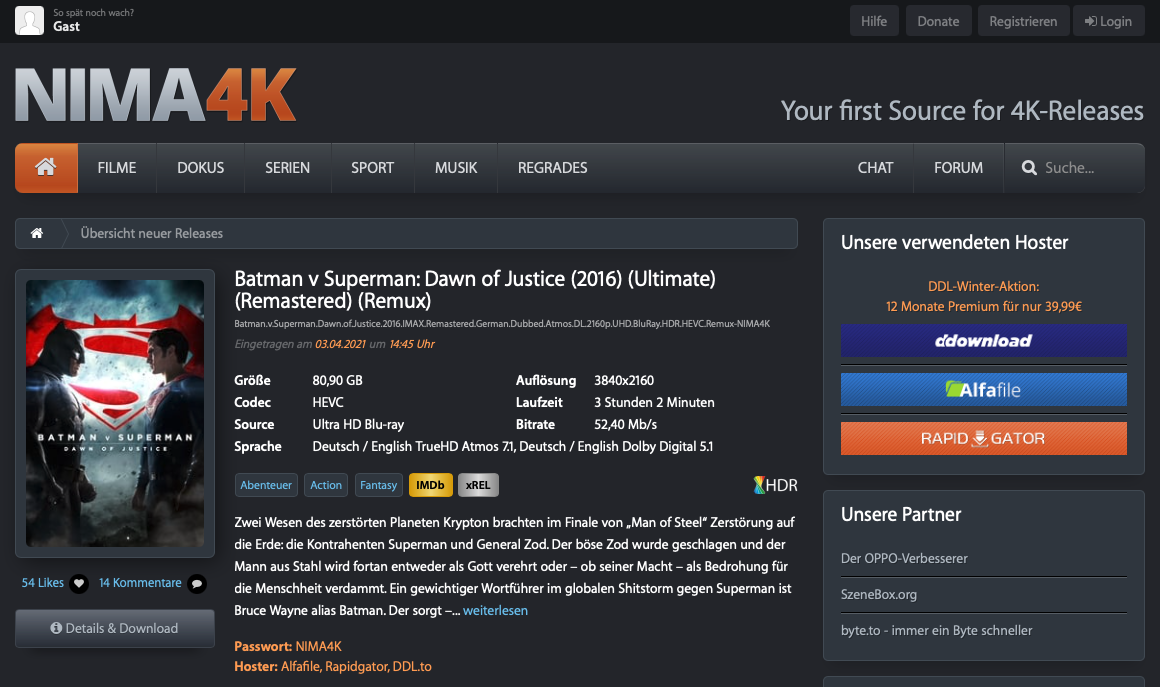 Auf der komplett werbefreien Seite sind beinahe tagtäglich neue Filme und Serien in 4K-Qualität verfügbar. Als Einnahmequelle dienen nur die Provisionen der drei Filehoster, die man bei NIMA4K für die Uploads einsetzt. Daneben gibt es noch die Möglichkeit, über verschiedene Wege dem Team etwas zu spenden. Doch die Erlöse derartiger Quellen werden bei der anhaltenden Kostenlos-Mentalität vieler Surfer wohl erfahrungsgemäß nicht sonderlich hoch ausfallen.