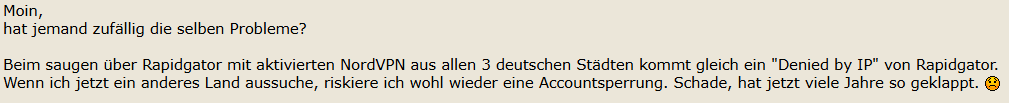 Wir haben eine Antwort auf unsere Presseanfrage erhalten. „NordVPN blockiert den Zugriff auf Rapidgator nicht. Wie Sie in Ihrem Artikel auch bereits schreiben: Die Einschränkung geht wahrscheinlich von Rapidgator aus. Nutzerinnen und Nutzer, die Schwierigkeiten beim Zugriff auf die Website haben, während sie mit NordVPN verbunden sind, sollten versuchen, sich mit anderen Servern zu verbinden.“ Wir kontaktieren Rapidgator, gehen aber eher nicht davon aus, dass wir auch eine Antwort erhalten.