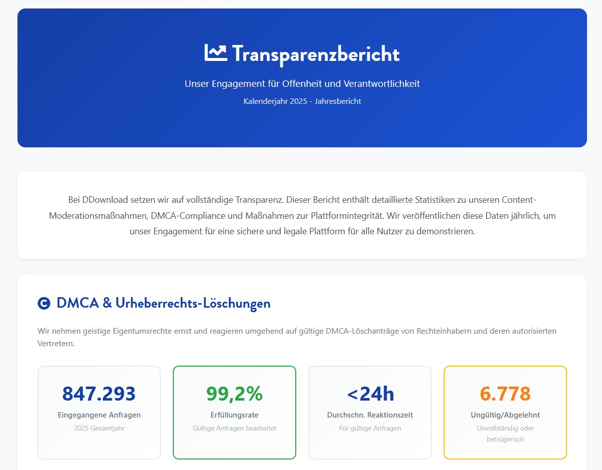 Der Bericht deckt den Zeitraum von Januar bis Dezember 2025 ab. Angeblich habe man ihn schrittweise veröffentlicht. Erst im April 2025 ging die Transparenzseite online, zunächst mit Quartalszahlen. Frühere Berichte existieren nicht. Es handelt sich also um den ersten Versuch von ddownload, öffentlich Rechenschaft über die Moderation und Rechtsdurchsetzung abzulegen. Das allerdings auffällig spät, wenn man bedenkt, wie lange es diesen Filehoster schon gibt.