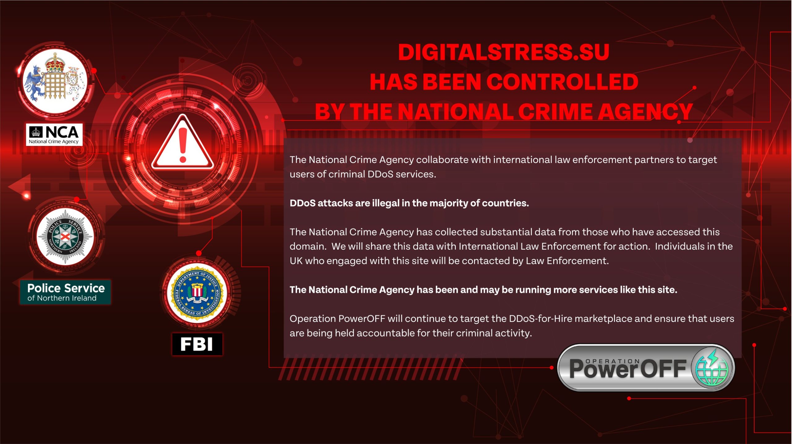 Die NCA übernahm kürzlich die Website und deaktivierte ihre Funktionen. Man ersetzte den Booter zunächst durch einen Honeypot. Später warnte man die Nutzer, dass die Strafverfolgungsbehörden ihre Daten erhalten würden.
