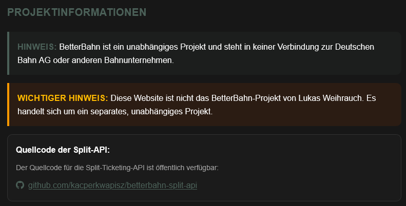 Mein Wunsch wäre, wenn die .eu Seite beim ersten Besuch darauf hinweist, dass sie nicht vom Betterbahn Projekt betrieben wird, aber auf dessen Software aufbaut. Das hab ich auch dem Betreiber der .eu Seite mitgeteilt aber es gibt scheinbar wenig Interesse für das Maß an klarer Kommunikation gegenüber Besucher*innen. Mein Eindruck ist, dass nur das Bare Minimum getan wird.