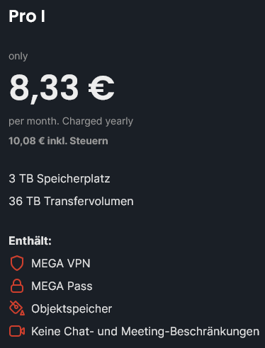 Pro I hat ab diesem Plan nicht nur den Speicher und Transfer mit drin, sondern auch noch zusätzlich einen eigenen VPN-Zugang für 10 Geräte, einen eigenen PW-Manager, sowie Zugang zum eigenen S4-Objektspeicher und unlimitierte Nutzung der eigenen Chat & Meeting Plattform inkl. Konferenzen, Telefonie (ohne / mit Video) Tools etc.
