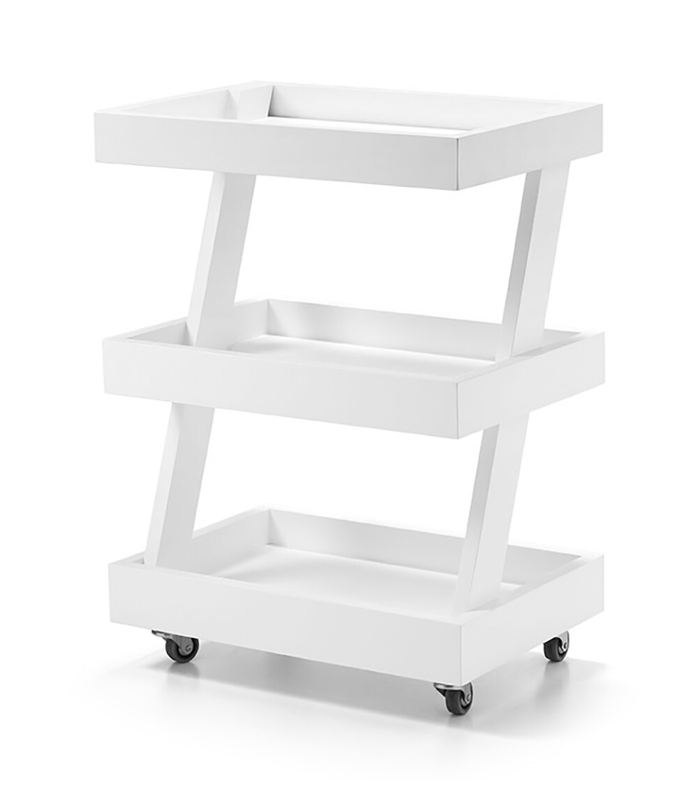 Der Beistelltisch Empress I mit weiß lackierter Oberfläche wird aus Holz gefertigt. Er bietet 3 große Abstellflächen und ist rollbar.