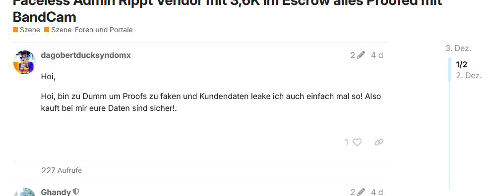 Wie hier sind wir auf dem Ripper-Board Faceless Vendor gewesen ca. 2 Monate und hatten davor ein TH der reibungslos ablief