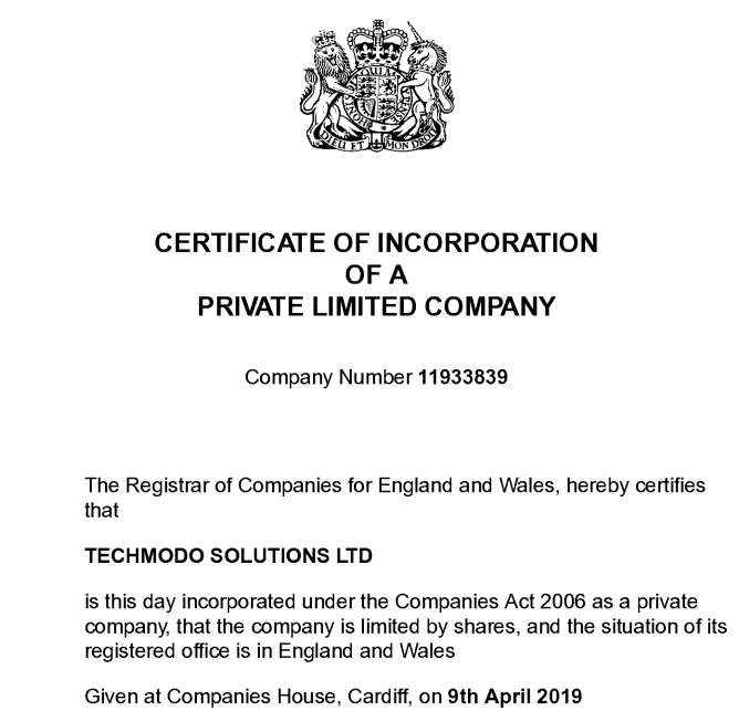 Handelsregisterauszug der TECHMODO SOLUTIONS LTD.
