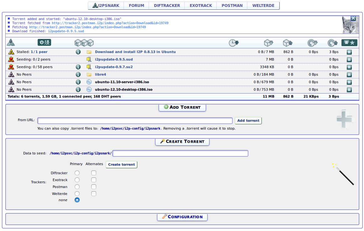 Edit: So, die 1.7 installiert, wow das reseeding geht ja schnell! Gerade mal ein paar Minuten! Eepsites gehen, i2psnark geht, postman tracker geht, er läd schon, und das MuWire ist neu hinzugekommen, sieht interessant aus.
