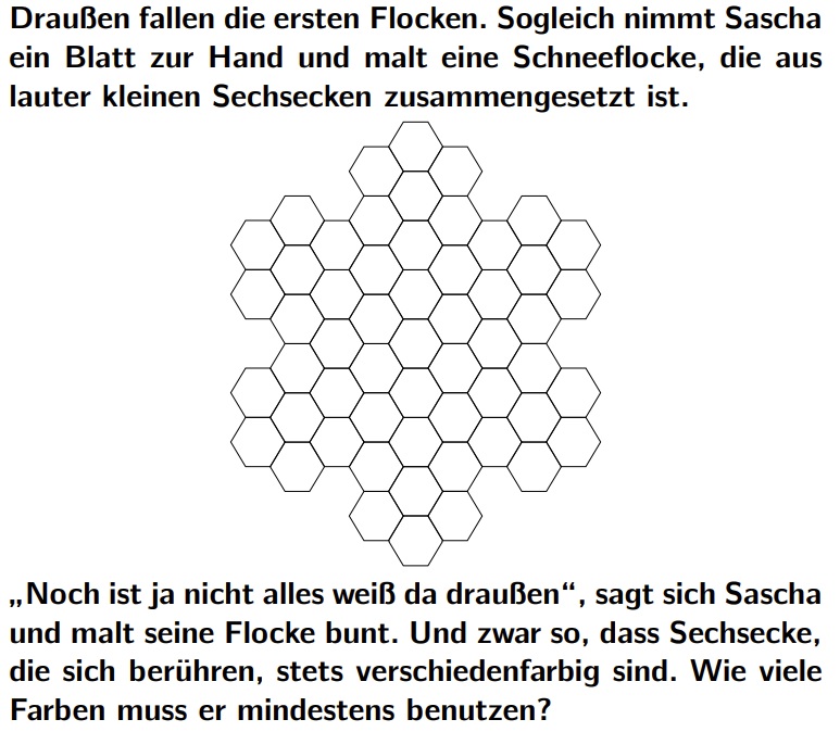 Es wird doch die Mindestmenge an Farben gesucht? Nehme ich die äußersten Sechsecke rundherum, haben die immer mind. drei Berührungsflächen mit anderen Sechsecken. Nach innen hin, werden das entsprechend mehr Berührungsflächen.