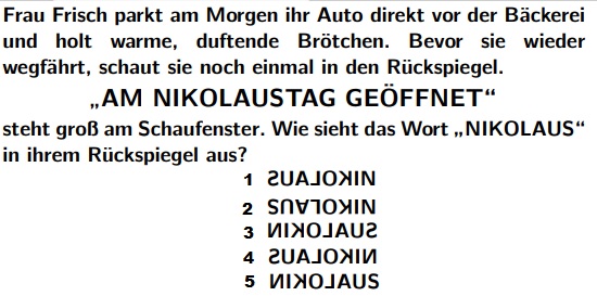 In einem Eisenbahnabteil sitzen 10 intelligente Menschen. Es gibt keinen Spiegel und diese Menschen reden nicht miteinander. Als der Schaffner kommt sagt dieser: „Mindestens zwei von euch sind im Gesicht dreckig. Alle Dreckigen sollten möglichst bald aussteigen und sich waschen.“