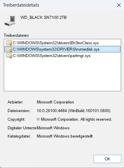 War die Umstellung erfolgreich, taucht die SSD nicht mehr unter „Laufwerke“ auf, sondern unter „Speichermedien“ im Geräte-Manager!! In den Treiberdetails findet sich der Eintrag „nvmedisk.sys“.