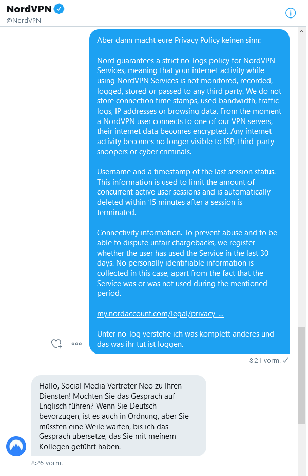 Gut der NordVPN „User“ hat mich überzeugt, dass der doch ein Bot ist:
